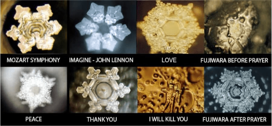 Scrisse che quando l’acqua congela, le molecole dell’acqua si accorpano sistematicamente e formano i nucleoni del cristallo. Questo si stabilizza solo se ha la struttura di un esagono, poi cresce e diviene un cristallo visibile. Questo è il decorso naturale. Se noi però forniamo all’acqua informazioni non naturali, non può formarsi nessun cristallo esagonale armonico. Le parole ‘grazie’, ‘amore’, ‘gratitudine’, sono una parte dei principi di base della natura. Per questo il cristallo forma la figura tradizionale di un bell’esagono. Invece la parola ‘sciocco’ non esiste in natura; è un termine innaturale coniato dall’uomo.