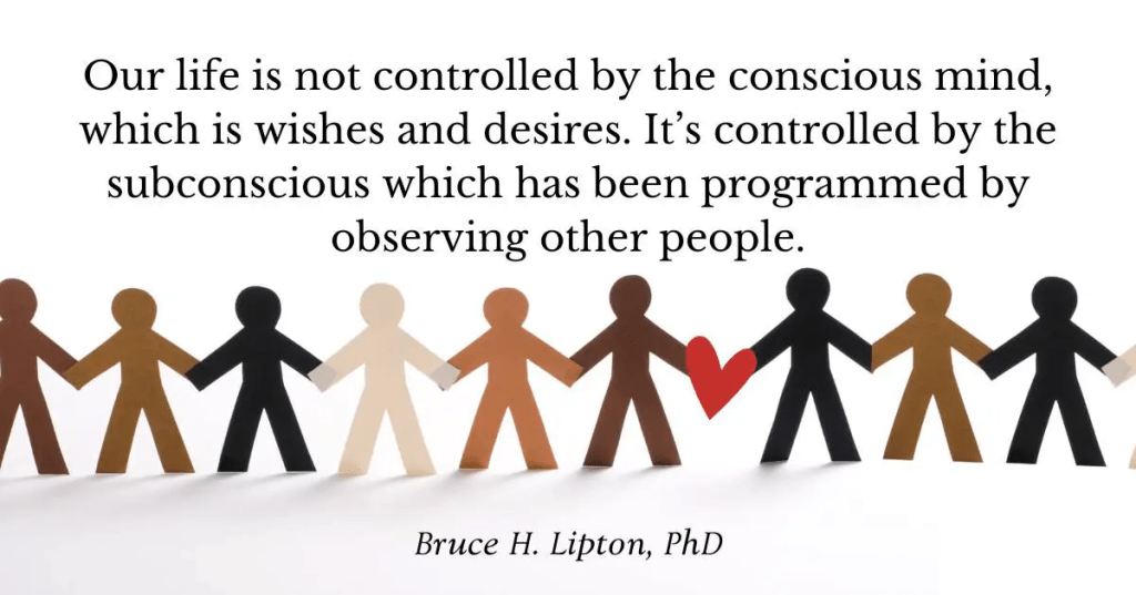 Le percezioni o convinzioni fondamentali sulla vita furono scaricate nella nostra mente subconscia osservando semplicemente i comportamenti e atteggiamenti dei nostri genitori, fratelli e sorelle, e altre persone nei primi sei anni di vita. L’efficacia dello sdoppiamento della nostra mente ora viene definita dalla qualità dei programmi trasmessi nella nostra mente subconscia.