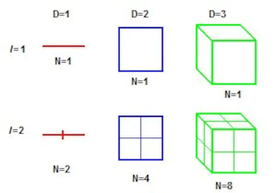 Osservando i tre numeri che abbiamo ottenuto è possibile vedere che ogni volta N è uguale a 2 elevato al numero delle dimensioni della figura, 21 nel caso del segmento, 22 nel caso del quadrato e 23 nel caso del cubo.