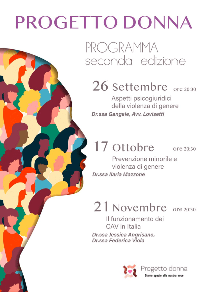 Progetto Donna è un progetto creativo, flessibile e dinamico che nasce dalla volontà di provare a fornire una possibile risposta al bisogno di parlare di violenza di genere e tutela minori e di farlo con professionalità, creatività e fornendo uno spazio sicuro ai professionisti e a chiunque voglia condividere la propria storia, le proprie esperienze professionali e competenze acquisite.
